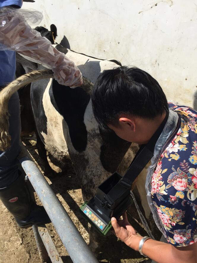 牧场繁育主管始终为奶牛受孕率提升,做深刻研究,在综合考察各项技术后,发现使用兽用B超比人工指捡要更精确,并且能够缩短胎间距,提升单产。